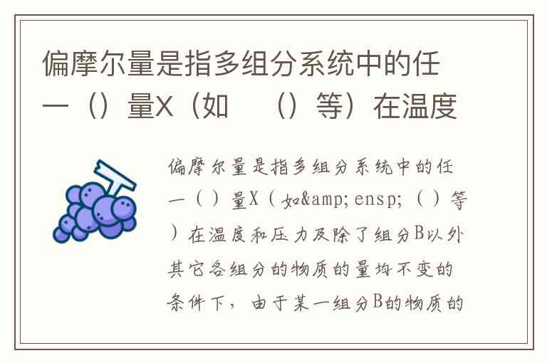 偏摩尔量是指多组分系统中的任一 广度 量 X(如 体积V、热力学能U、焓H、熵S、吉布斯函数G、亥姆霍兹函数F 等)在温度和压力及除了组分B以外其它各组分的物质的量均不变的条件下,由于某一组分B的物质的量的极微而引起系统 广度 量 X 随组分B的物质的量的变化率。