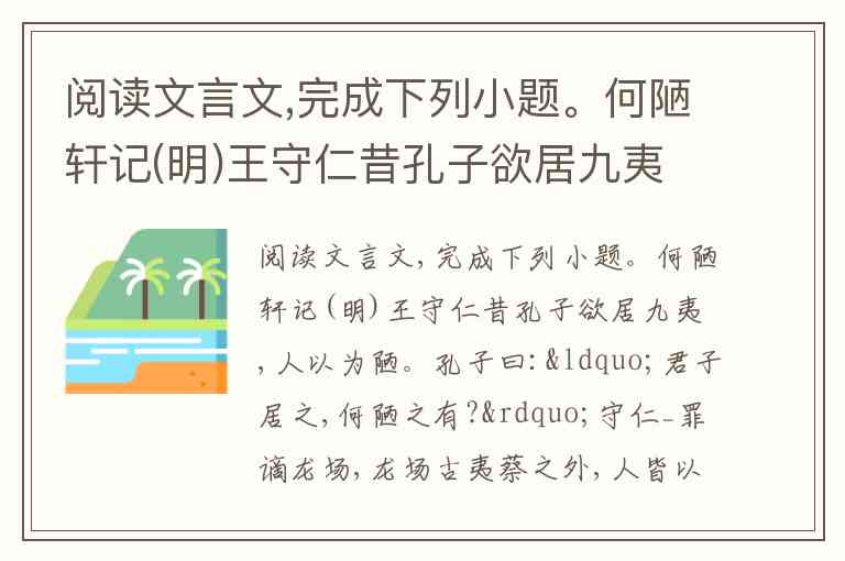 阅读文言文,完成下列小题。何陋轩记(明)王守仁昔孔子欲居九夷,人以为陋。孔子曰:“君子居之,何陋之有?”守仁_罪谪龙场,龙场古夷蔡之外,人皆以予自上国 ① 往,将陋其地,弗能居也。而予处之旬月,安而乐之,求其所谓甚陋者而莫得。独其结题鸟言,山栖羝服 ② , 无轩裳宫室之观,文仪揖让之缛,然此犹淳庞质素之遗焉,不得以为陋也。始予至,无室以止,居于丛棘之间,则郁也;迁于东峰,就石穴而居之,又阴以湿。龙场之民,老稚日来视,予喜不予陋,益予比。予尝圃于丛棘之右,民谓予之乐之也,相与伐木阁之材,就其地为轩以居予。予因而翳之以桧竹,莳之以卉药,列堂阶,办室奥,琴编图史,讲诵游适之道略具,学士之来游者,亦稍稍而集。于是人之及吾轩者,若观于通都焉,而予亦忘予之居夷也。因名之曰“何陋”,以信 ③ 孔子之言。嗟夫!诸夏之盛,其典章礼乐,历圣修而传之,夷不能有也,则谓之陋固宜。于后蔑道德而专法令,搜抉钩絷之术穷,而狡匿谲诈,无所不至,浑朴尽矣!夷之民,方若未琢之璞,未绳之木,虽粗砺顽梗,而椎斧尚有施也,安可以陋之?斯孔子所为欲居也欤?虽然,典章文物,则亦胡可以无讲?今夷之俗,崇巫而事鬼,渎礼而任情,不中不节,卒未免于陋之名,则亦不讲于是耳。然此无损于其质也。诚有君子而居焉,其化之也盖易。而予非其人也,记之以俟来者。(选自《王文成公全书》卷二十三)[注]①上国:指京城。②结题鸟言,山栖羝服:指少数民族的一些生活习俗。结题:结发于额;羝服:指用羊皮做的衣服。③信,通“伸”,伸张。(1)可填入第①段横线处的虚词是( ) A. 之 B. 其 C. 以 D. 而