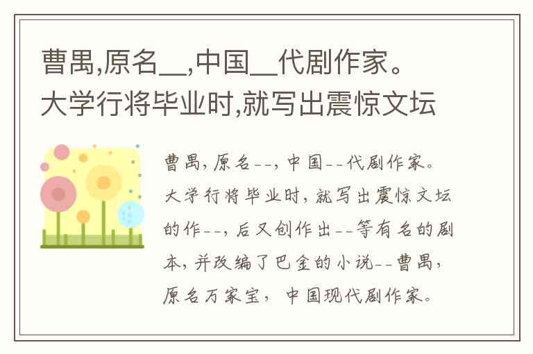 曹禺,原名__,中国__代剧作家。大学行将毕业时,就写出震惊文坛的作__,后又创作出__等有名的剧本,并改编了巴金的小说__
