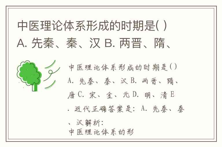 中医理论体系形成的时期是( ) A. 先秦、秦、汉 B. 两晋、隋、唐 C. 宋、金、元 D. 明、清 E. 近代