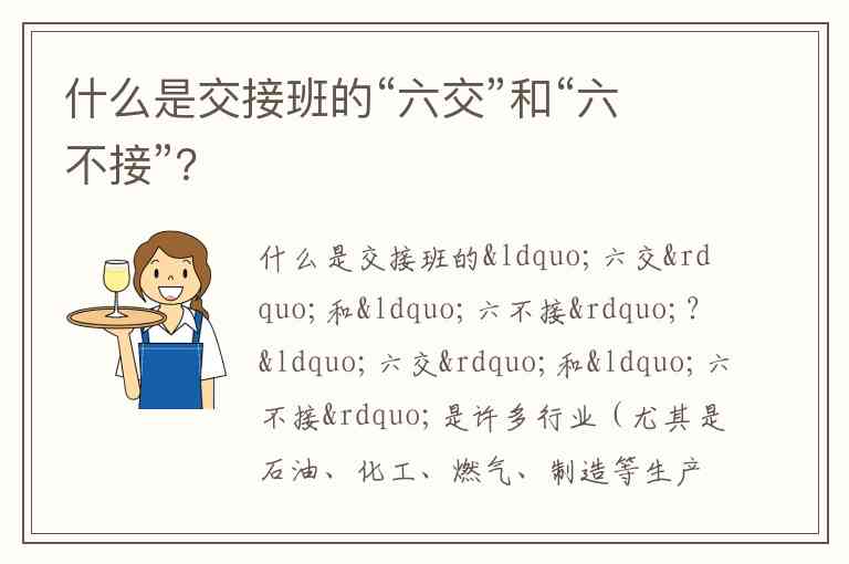 “六交”和“六不接”是许多行业(尤其是石油、化工、燃气、制造等生产型企业)在交接班制度中,为确保安全生产和责任落实而制定的核心原则。虽然不同企业的具体表述可能略有差异,但核心精神高度一致。