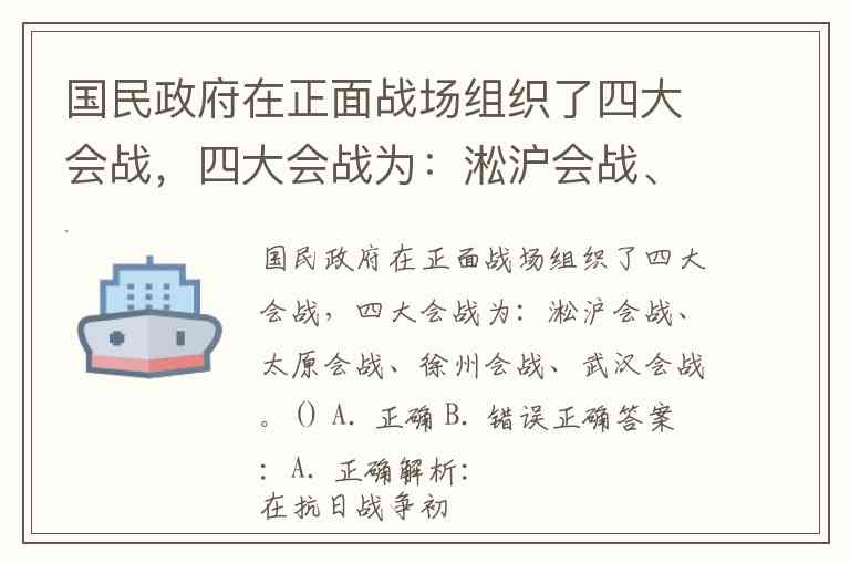 国民政府在正面战场组织了四大会战,四大会战为:淞沪会战、太原会战、徐州会战、武汉会战。() A. 正确 B. 错误