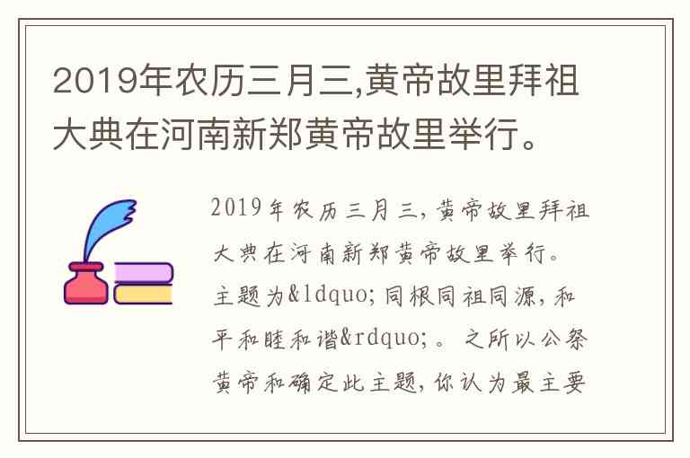 2019年农历三月三,黄帝故里拜祖大典在河南新郑黄帝故里举行。主题为“同根同祖同源,和平和睦和谐”。之所以公祭黄帝和确定此主题,你认为最主要原因是 A. 是中华民族的“人文始祖” B. 发明了文字、编制了乐谱 C. 制作衣裳、挖掘水井 D. 治水有功,三过家门而不入
