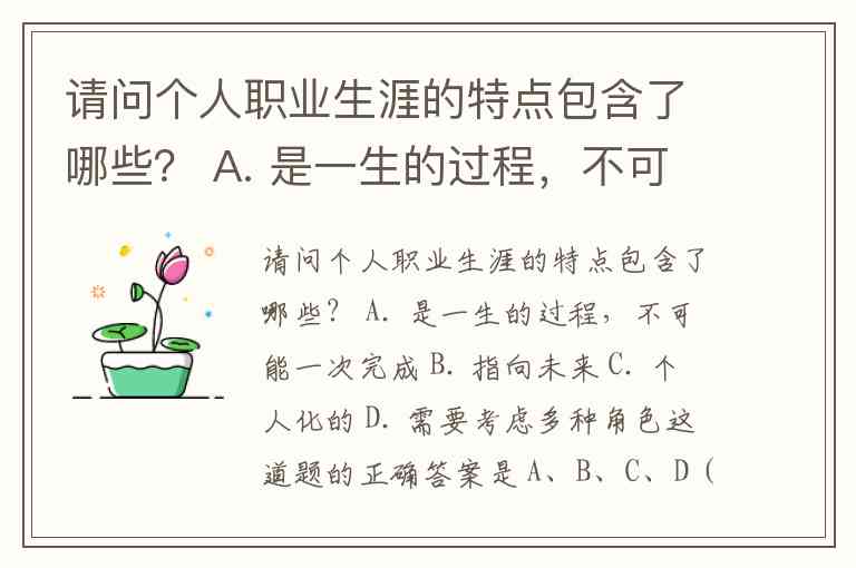 请问个人职业生涯的特点包含了哪些? A. 是一生的过程,不可能一次完成 B. 指向未来 C. 个人化的 D. 需要考虑多种角色