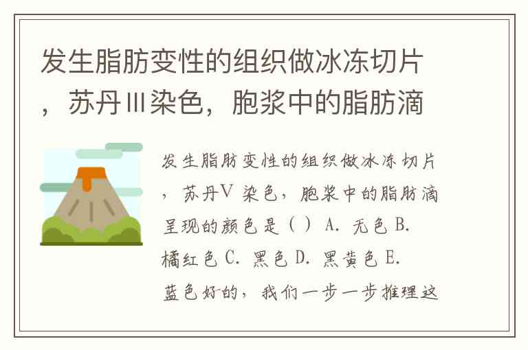 发生脂肪变性的组织做冰冻切片,苏丹Ⅲ染色,胞浆中的脂肪滴呈现的颜色是() A. 无色 B. 橘红色 C. 黑色 D. 黑黄色 E. 蓝色