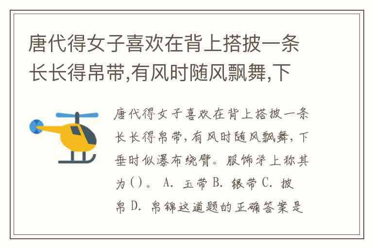 唐代得女子喜欢在背上搭披一条长长得帛带,有风时随风飘舞,下垂时似瀑布绕臂。服饰学上称其为( )。 A. 玉带 B. 银带 C. 披帛 D. 帛锦