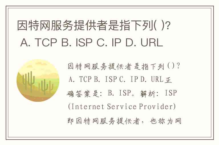 因特网服务提供者是指下列( )? A. TCP B. ISP C. IP D. URL