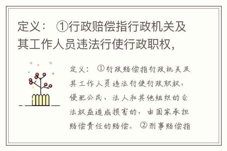 ① 行政赔偿:行政机关工作人员违法行使职权造成损害,国家承担赔偿责任。
