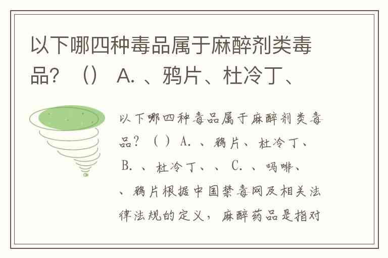 以下哪四种毒品属于麻醉剂类毒品?() A. 、鸦片、杜冷丁、 B. 、杜冷丁、、 C. 、吗啡、、鸦片