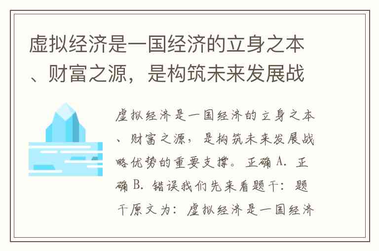 虚拟经济是一国经济的立身之本、财富之源,是构筑未来发展战略优势的重要支撑。正确 A. 正确 B. 错误