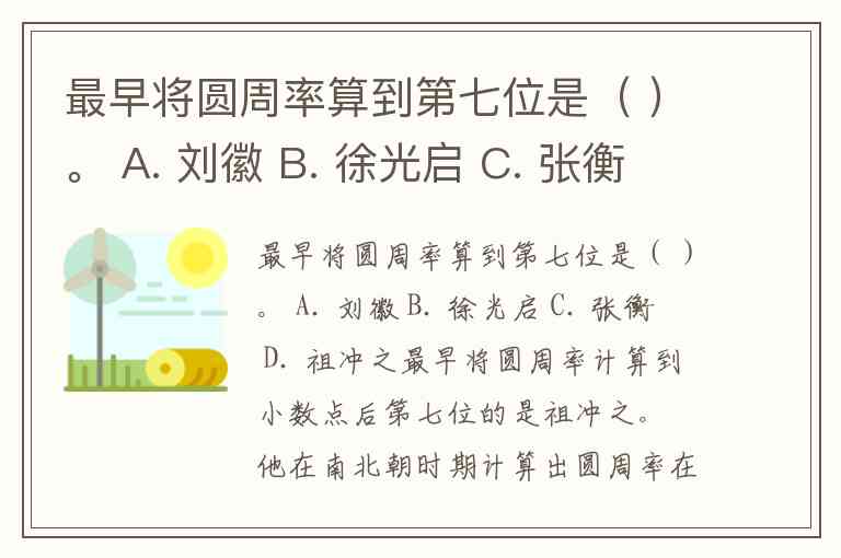 最早将圆周率算到第七位是( )。 A. 刘徽 B. 徐光启 C. 张衡 D. 祖冲之