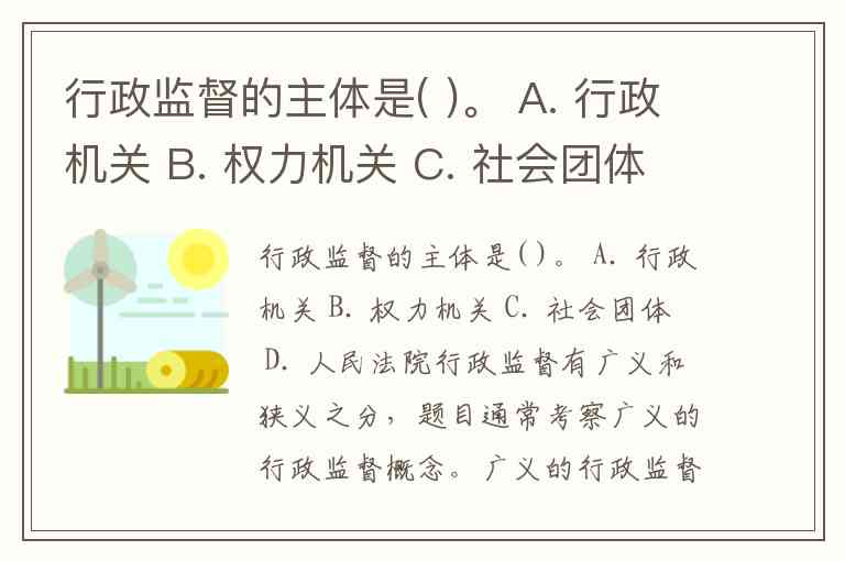 行政监督的主体是( )。 A. 行政机关 B. 权力机关 C. 社会团体 D. 人民法院
