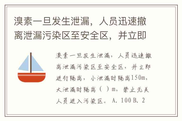 溴素一旦发生泄漏,人员迅速撤离泄漏污染区至安全区,并立即进行隔离,小泄漏时隔离150m,大泄漏时隔离( )m,禁止无关人员进入污染区。 A. 100 B. 200 C. 300 D. 330