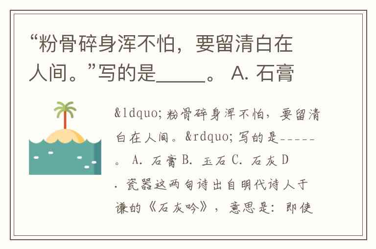 “粉骨碎身浑不怕,要留清白在人间。”写的是_____。 A. 石膏 B. 玉石 C. 石灰 D. 瓷器