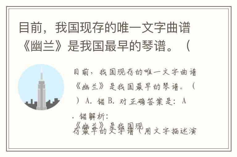 目前,我国现存的唯一文字曲谱《幽兰》是我国最早的琴谱。( ) A. 错 B. 对
