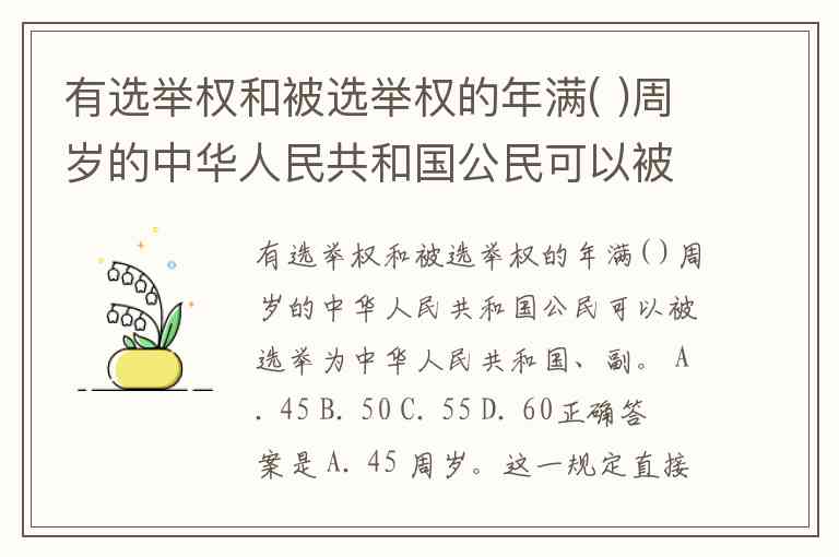 有选举权和被选举权的年满( )周岁的中华人民共和国公民可以被选举为中华人民共和国、副。 A. 45 B. 50 C. 55 D. 60