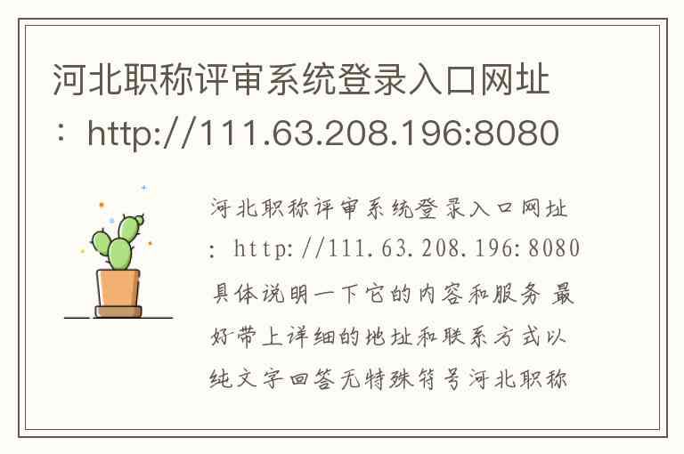 河北职称评审系统登录入口网址http://111.63.208.196:8080是河北省职称评审工作的官方在线平台,主要为河北省内专业技术人员提供职称申报、材料提交、评审进度查询等服务。该系统整合了职称评审的全流程管理功能,用户可通过注册账号登录后,根据自身专业领域选择相应的评审通道,按要求填写个人信息、工作业绩、学术成果等申报材料,并在线提交至相关评审机构。系统还提供评审政策解读、申报指南、常见问题解答等辅助功能,帮助用户了解评审标准和流程。