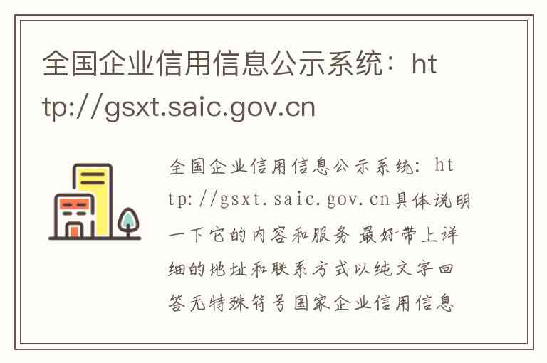 全国企业信用信息公示系统:http://gsxt.saic.gov.cn具体说明一下它的内容和服务 最好带上详细的地址和联系方式以纯文字回答无特殊符号