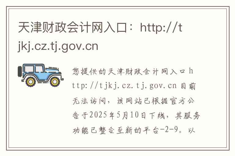您提供的天津财政会计网入口 http://tjkj.cz.tj.gov.cn 目前无法访问,该网站已根据官方公告于2025年5月10日下线,其服务功能已整合至新的平台-2-9。以下为您整理了最新的官方服务平台、服务内容及联系方式。