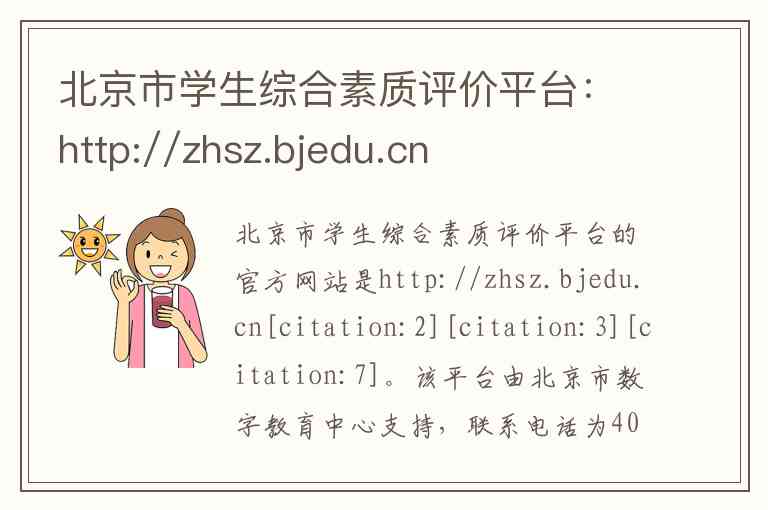 北京市学生综合素质评价平台的官方网站是http://zhsz.bjedu.cn[citation:2][citation:3][citation:7]。该平台由北京市数字教育中心支持,联系电话为4000168855,客服工作时间是周一至周五的8:00至17:00。为了获得最佳使用体验,平台推荐使用Google Chrome、Microsoft Edge或360浏览器的极速模式访问。