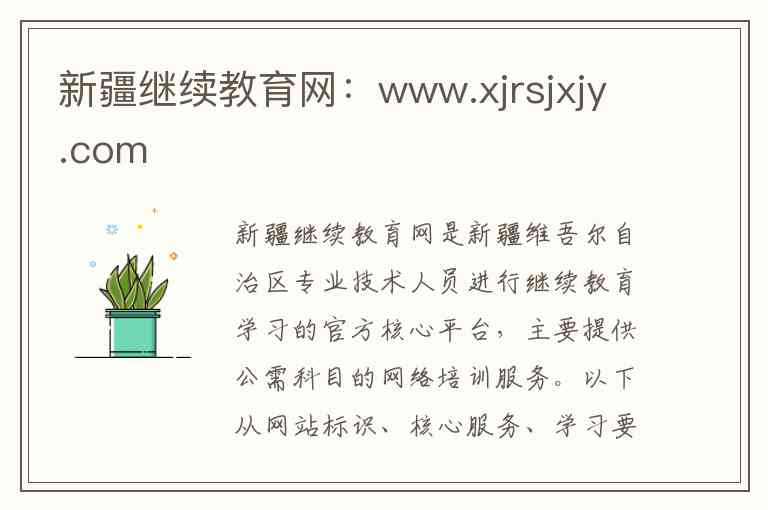 新疆继续教育网是新疆维吾尔自治区专业技术人员进行继续教育学习的官方核心平台,主要提供公需科目的网络培训服务。以下从网站标识、核心服务、学习要求、官方政策及联系方式等方面为您进行详细说明。
