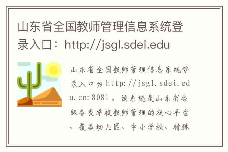 山东省全国教师管理信息系统登录入口为 http://jsgl.sdei.edu.cn:8081 。该系统是山东省各级各类学校教师管理的核心平台,覆盖幼儿园、中小学校、特殊教育学校、中等职业学校、高职专科院校和省属本科院校的教师信息 -9。其核心内容和服务功能以及相关联系方式说明如下。