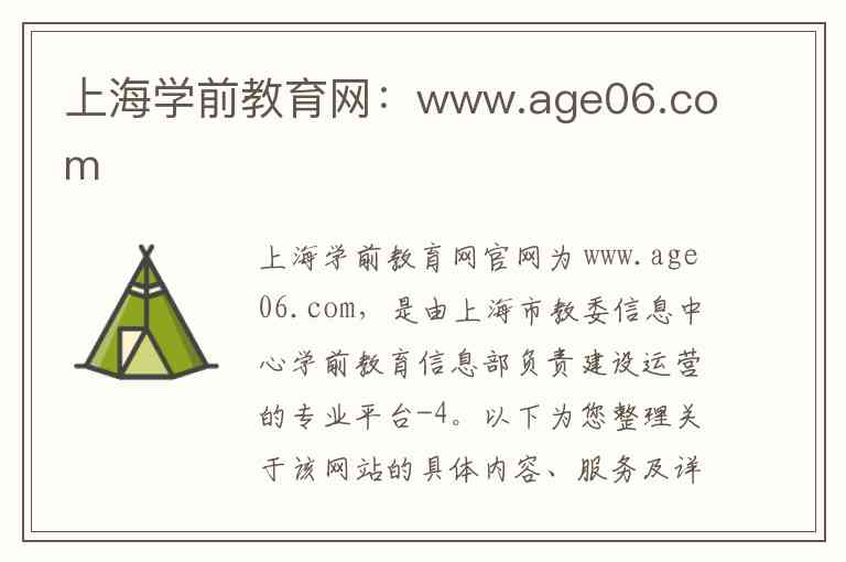 上海学前教育网官网为 www.age06.com,是由上海市教委信息中心学前教育信息部负责建设运营的专业平台-4。以下为您整理关于该网站的具体内容、服务及详细联系方式。
