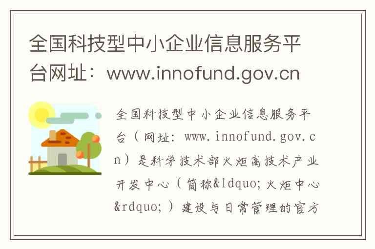 全国科技型中小企业信息服务平台(网址:www.innofund.gov.cn)是科学技术部火炬高技术产业开发中心(简称“火炬中心”)建设与日常管理的官方服务平台 -1-8。该平台的核心目标是落实科技型中小企业评价工作,构建全国科技型中小企业信息库,并为广大中小企业提供高效便捷的创新政策服务 -1-4。