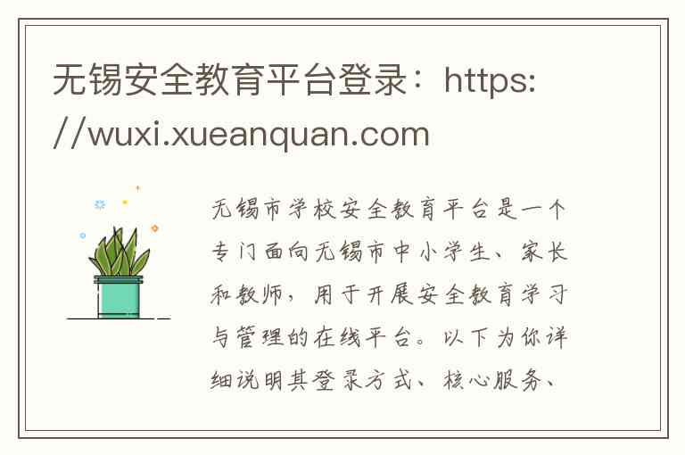 无锡市学校安全教育平台是一个专门面向无锡市中小学生、家长和教师,用于开展安全教育学习与管理的在线平台。以下为你详细说明其登录方式、核心服务、联系方式及其他相关信息。