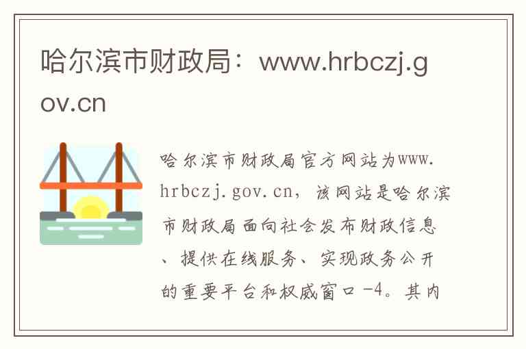 哈尔滨市财政局官方网站为www.hrbczj.gov.cn,该网站是哈尔滨市财政局面向社会发布财政信息、提供在线服务、实现政务公开的重要平台和权威窗口 -4。其内容与服务主要涵盖以下几个方面: