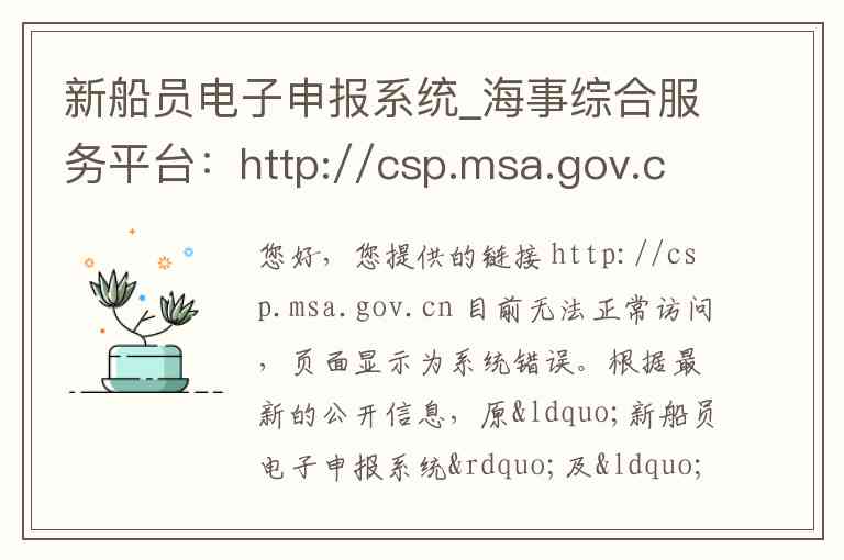 您好,您提供的链接 http://csp.msa.gov.cn 目前无法正常访问,页面显示为系统错误。根据最新的公开信息,原“新船员电子申报系统”及“海事综合服务平台”的服务已进行迁移和整合。以下为您梳理了该平台的历史服务内容、当前最新的访问渠道以及官方联系方式。