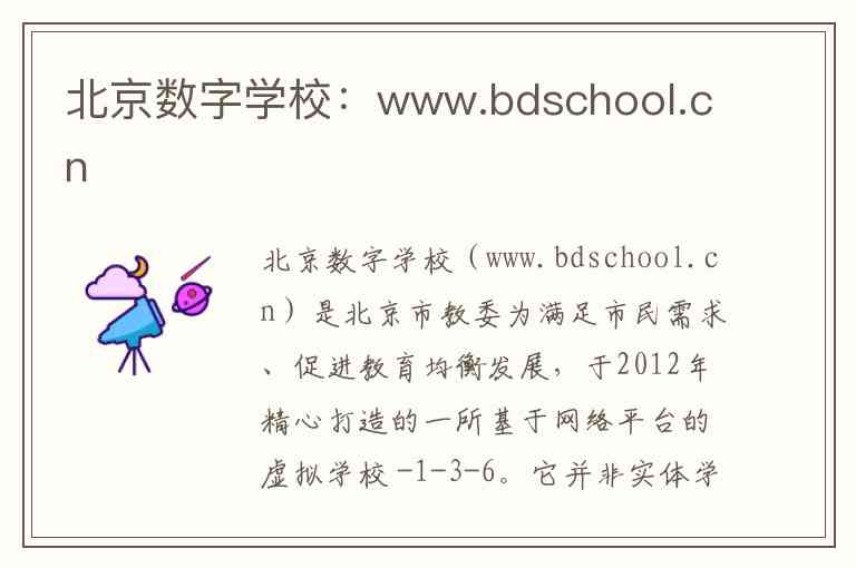 北京数字学校(www.bdschool.cn)是北京市教委为满足市民需求、促进教育均衡发展,于2012年精心打造的一所基于网络平台的虚拟学校 -1-3-6。它并非实体学校,而是一个提供优质数字教育资源的公共服务平台,旨在将北京四中、人大附中、北京小学等名校的名师课程免费提供给全市乃至更广范围的学生 -3-6。
