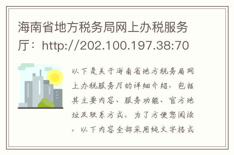 以下是关于海南省地方税务局网上办税服务厅的详细介绍,包括其主要内容、服务功能、官方地址及联系方式。为了方便您阅读,以下内容全部采用纯文字格式。