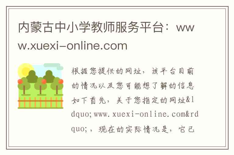 首先,关于您指定的网址“www.xuexi-online.com”,现在的实际情况是,它已经不再是“内蒙古中小学教师服务平台”的访问入口。根据最新的官方信息,内蒙古自治区面向中小学教师的官方服务平台已全面升级和迁移。该网站在历史上曾是一个名为“内蒙古中小学教师培训监管服务平台”或“内蒙古学习在线”的网站,由一家名为“内蒙古聚诚信息技术有限公司”的企业运营 -4。但目前这个平台的主要功能和服务已整合至新的官方平台。