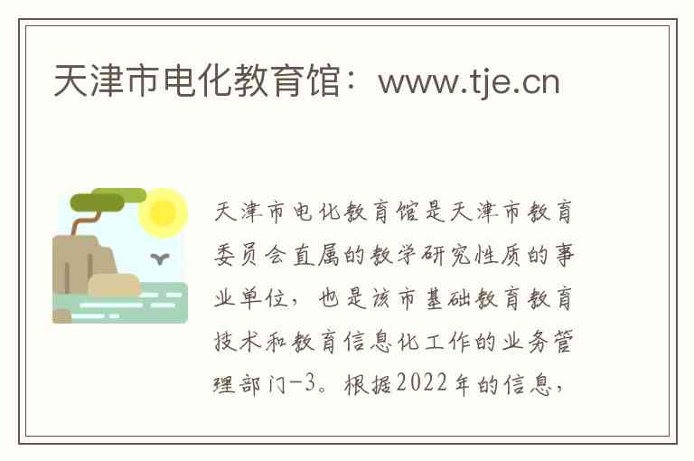 天津市电化教育馆是天津市教育委员会直属的教学研究性质的事业单位,也是该市基础教育教育技术和教育信息化工作的业务管理部门-3。根据2022年的信息,其职能已整合进天津市教育科学研究院,成为内设的“教育技术与信息化研究中心”-4。