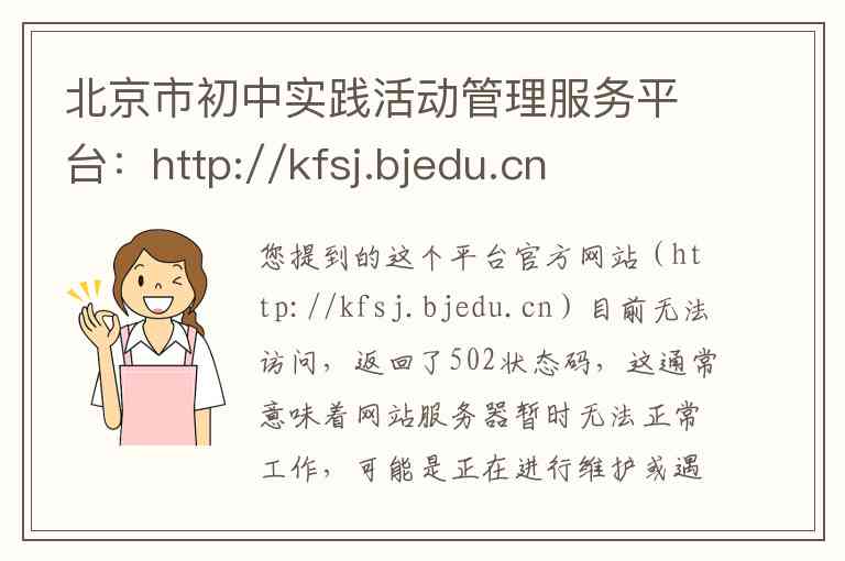 您提到的这个平台官方网站(http://kfsj.bjedu.cn)目前无法访问,返回了502状态码,这通常意味着网站服务器暂时无法正常工作,可能是正在进行维护或遇到了技术问题。