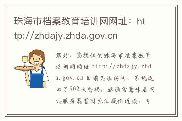 您好,您提供的珠海市档案教育培训网网址 http://zhdajy.zhda.gov.cn 目前无法访问,系统返回了502状态码。这通常意味着网站服务器暂时无法提供连接,可能是由于维护、网络问题或网站架构调整导致,建议您稍后再试。