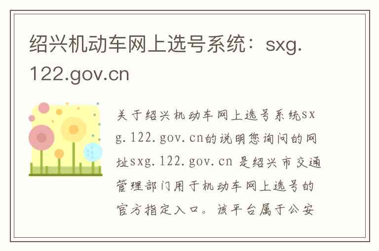 您询问的网址sxg.122.gov.cn 是绍兴市交通管理部门用于机动车网上选号的官方指定入口。该平台属于公安部交通安全综合服务管理平台的地方分支,旨在为绍兴地区的车主提供便捷的互联网预选号牌服务-2。以下将对其内容、服务及相关信息进行详细说明。