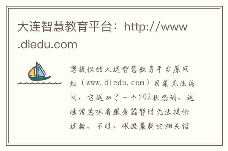 您提供的大连智慧教育平台原网址(www.dledu.com)目前无法访问,它返回了一个502状态码,这通常意味着服务器暂时无法提供连接。不过,根据最新的相关信息,该平台已完成升级改版,并启用了新的访问地址。以下为您整理了关于该平台的内容、服务及联系方式的详细信息。