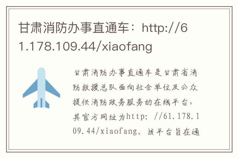 甘肃消防办事直通车是甘肃省消防救援总队面向社会单位及公众提供消防政务服务的在线平台,其官方网址为http://61.178.109.44/xiaofang。该平台旨在通过信息化手段简化办事流程,为群众提供便捷的消防业务办理渠道。