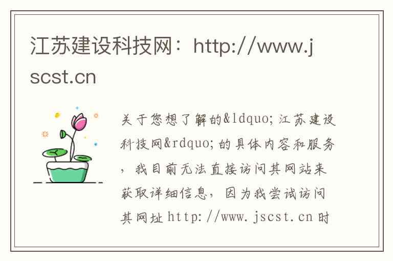 关于您想了解的“江苏建设科技网”的具体内容和服务,我目前无法直接访问其网站来获取详细信息,因为我尝试访问其网址 http://www.jscst.cn 时遇到了技术故障,未能成功读取到网页内容。