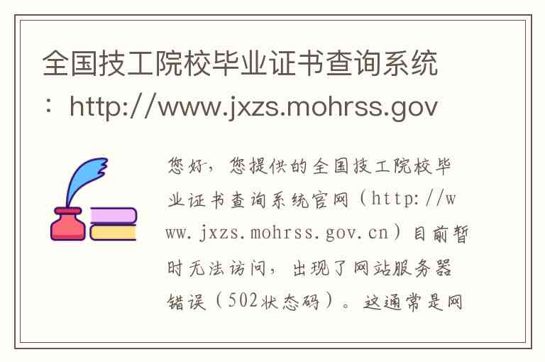 您好,您提供的全国技工院校毕业证书查询系统官网(http://www.jxzs.mohrss.gov.cn)目前暂时无法访问,出现了网站服务器错误(502状态码)。这通常是网站自身正在进行维护或出现了临时故障,建议您稍后再尝试访问。