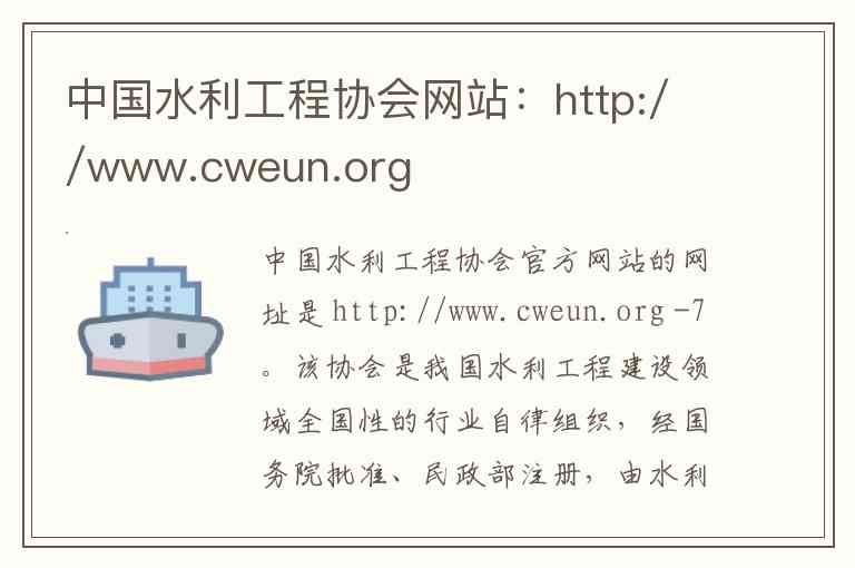中国水利工程协会官方网站的网址是 http://www.cweun.org -7。该协会是我国水利工程建设领域全国性的行业自律组织,经国务院批准、民政部注册,由水利部主管 -7-10。其官方平台为广大从业者、企事业单位及社会公众提供了丰富的内容与服务,主要涵盖以下几个方面: