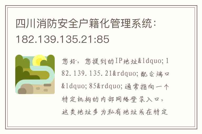 您好,您提到的IP地址“182.139.135.21”配合端口“85”通常指向一个特定机构的内部网络登录入口,这类地址多为私有地址或在特定局域网内使用,因此无法查询到对应这个具体IP和端口的四川省消防安全户籍化管理系统的官方说明、地址及联系方式。