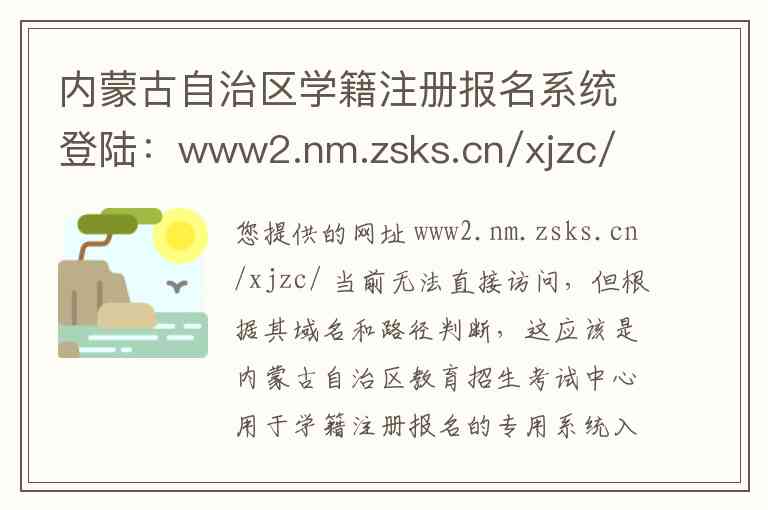 您提供的网址 www2.nm.zsks.cn/xjzc/ 当前无法直接访问,但根据其域名和路径判断,这应该是内蒙古自治区教育招生考试中心用于学籍注册报名的专用系统入口。基于内蒙古招生考试信息网官方发布的信息,为您详细说明该系统所涉及的服务内容、官方主入口以及相关联系方式。