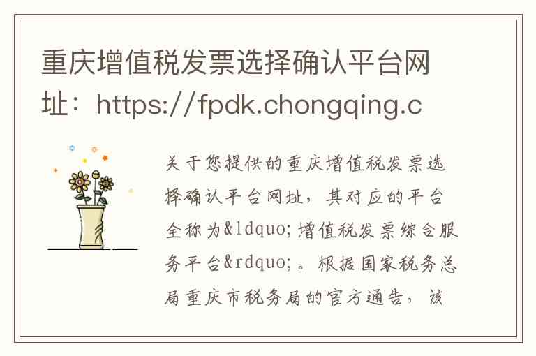 关于您提供的重庆增值税发票选择确认平台网址,其对应的平台全称为“增值税发票综合服务平台”。根据国家税务总局重庆市税务局的官方通告,该平台的服务内容和访问方式在近期有重要调整。