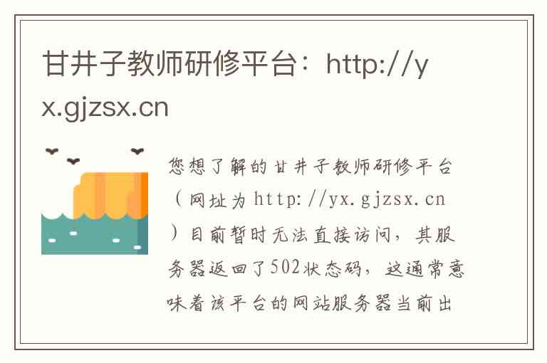 您想了解的甘井子教师研修平台(网址为 http://yx.gjzsx.cn )目前暂时无法直接访问,其服务器返回了502状态码,这通常意味着该平台的网站服务器当前出现了临时问题或正在维护中,无法正常显示页面内容。