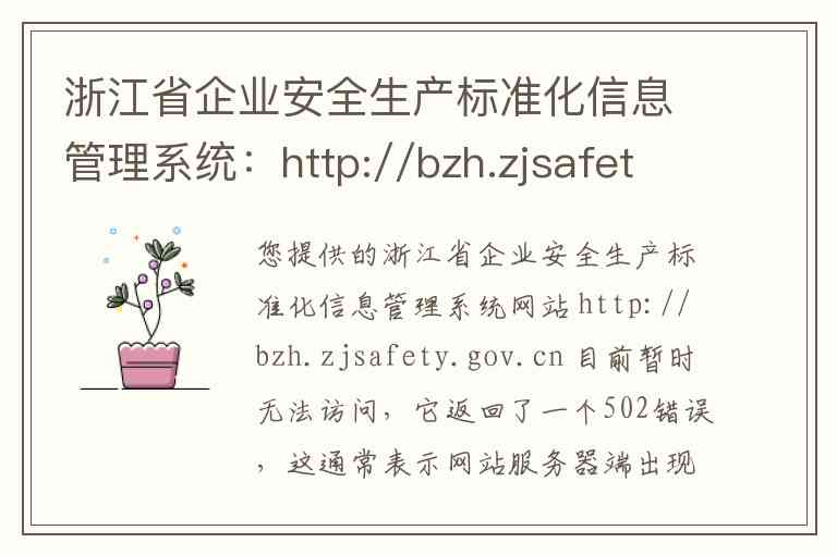 您提供的浙江省企业安全生产标准化信息管理系统网站 http://bzh.zjsafety.gov.cn 目前暂时无法访问,它返回了一个502错误,这通常表示网站服务器端出现了暂时的连接问题,可能正在维护或遇到故障。