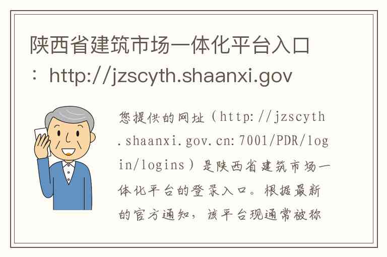 您提供的网址(http://jzscyth.shaanxi.gov.cn:7001/PDR/login/logins)是陕西省建筑市场一体化平台的登录入口。根据最新的官方通知,该平台现通常被称为“陕西省建筑市场监管与诚信一体化管理系统”,其主要入口已整合至“陕西省住房和城乡建设厅官网”或“陕西省政务服务网”-3-4-6。