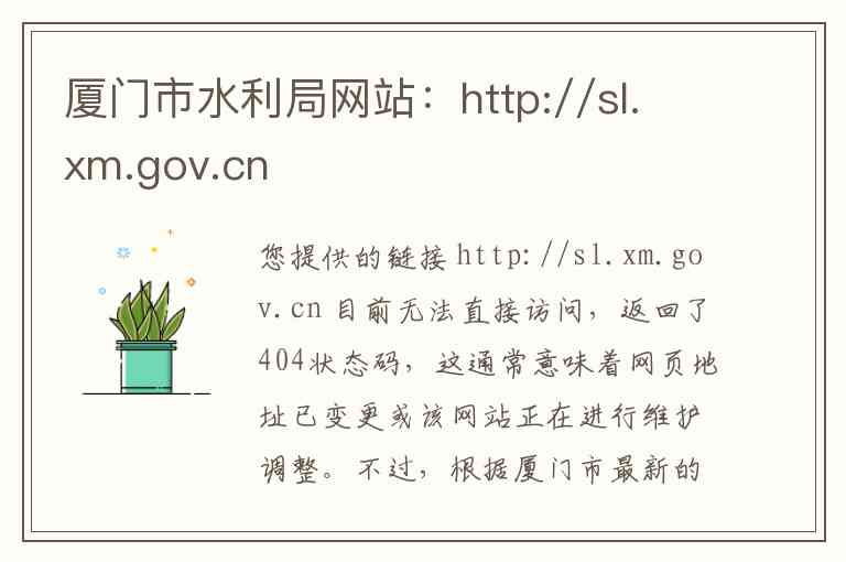 您提供的链接 http://sl.xm.gov.cn 目前无法直接访问,返回了404状态码,这通常意味着网页地址已变更或该网站正在进行维护调整。